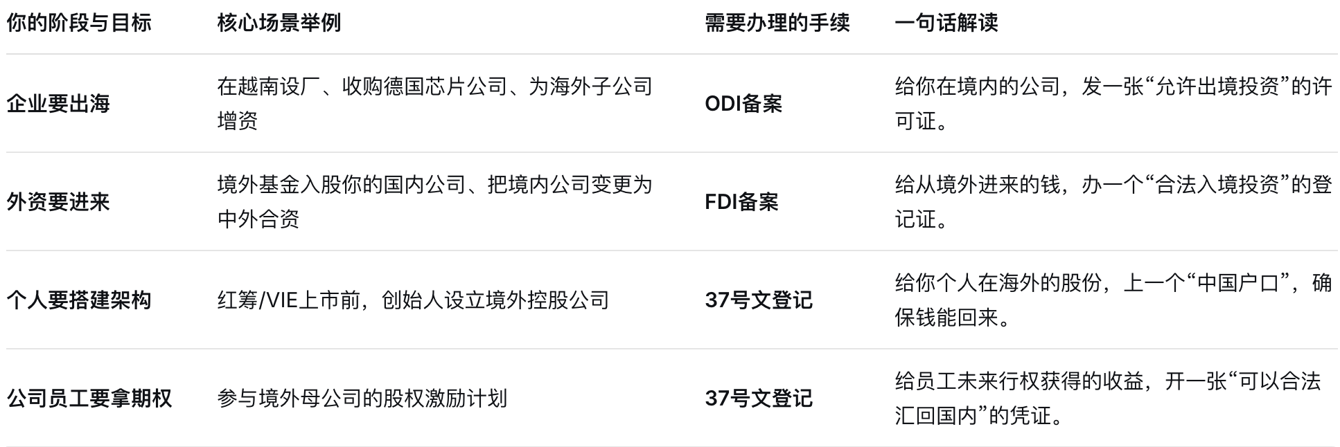 简单粗暴地记:公司出海找ODI,外资入境找FDI,个人跨境上市找37号文。