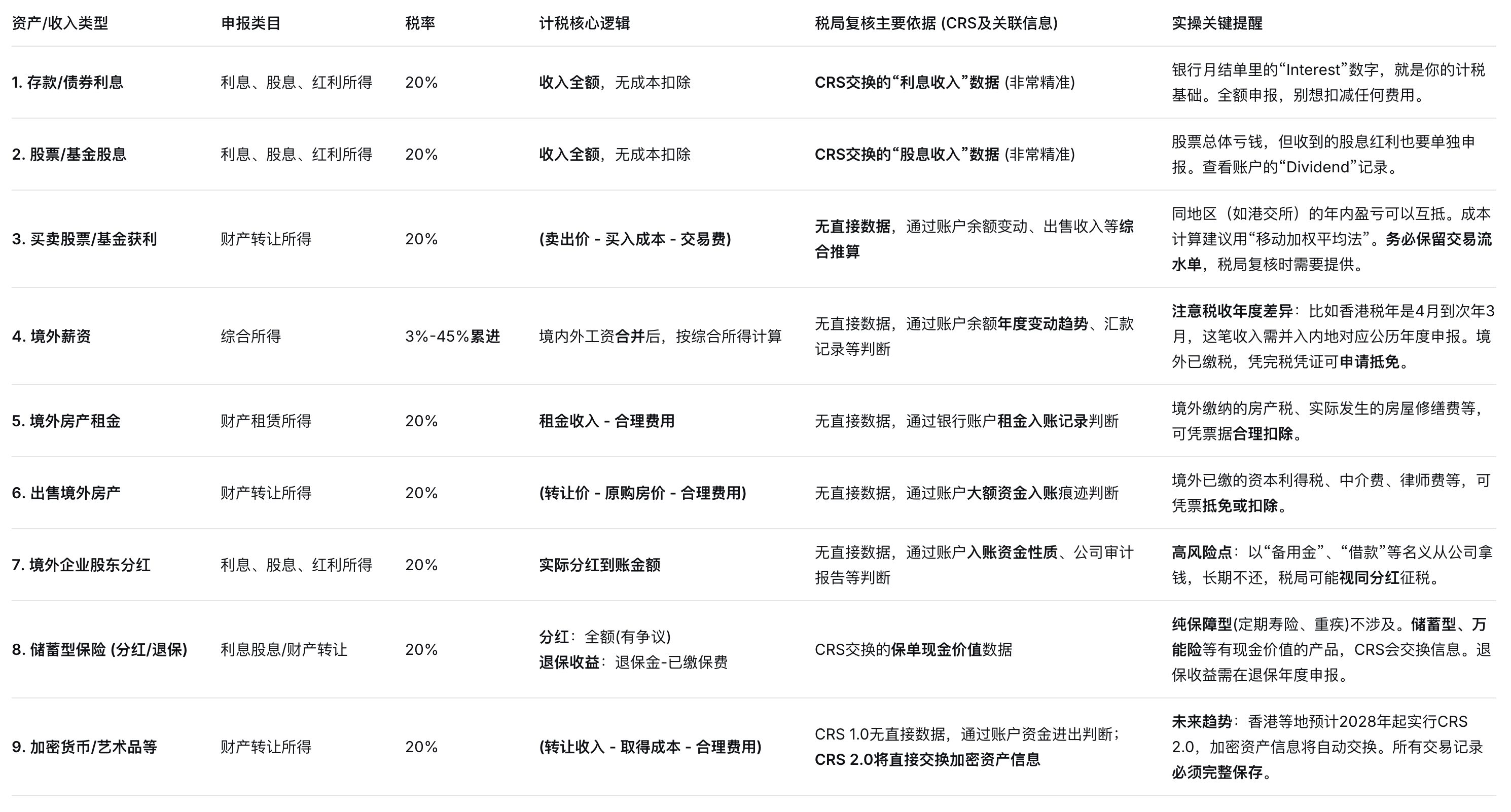 二、一张表讲透:9类常见境外资产怎么报、税局怎么核